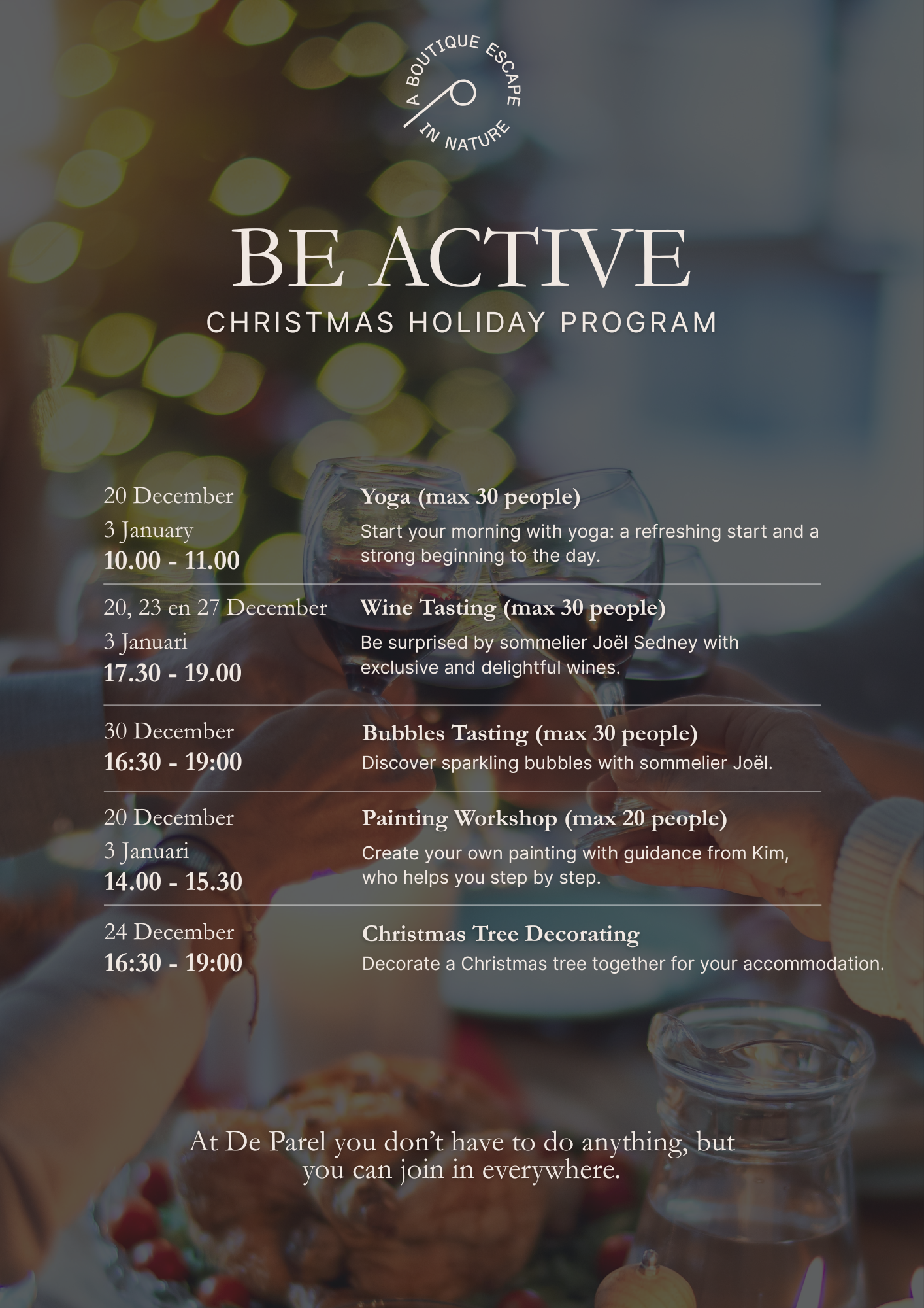 There’s so much to experience at our resort and in the surrounding area. Take a walk in the nearby nature reserve 'Het Horsterwold' and be amazed by the magic of winter. But... during the Christmas holidays, you can also fully enjoy yourself at the Parel. Taste the flavors of local and well-known wines during a cozy tasting, or experience a relaxing vacation with our yoga and wellness area.